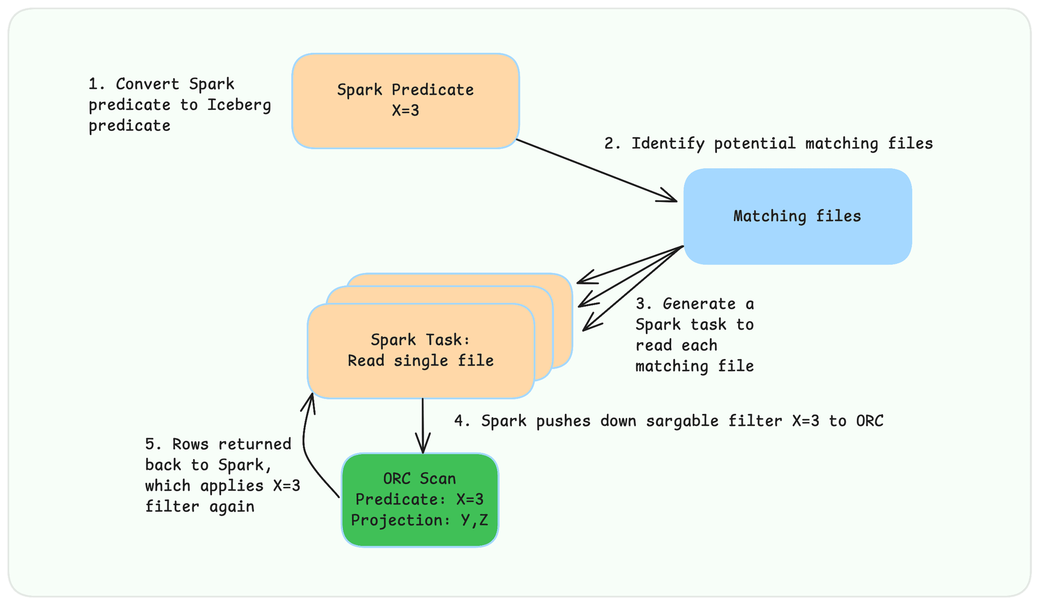 When scanning a file, each format needs to specify the in-memory format that batches get read into, for example the ReadSupport interface in Parquet. As an example, say that we wish to initiate a data scan of an Iceberg table consisting of ORC files, each with fields (X Y Z), and we’d like to execute the query SELECT Y, Z FROM table WHERE X = 3 using Apache Spark SQL. The sequence of steps that Iceberg internally executes looks something like